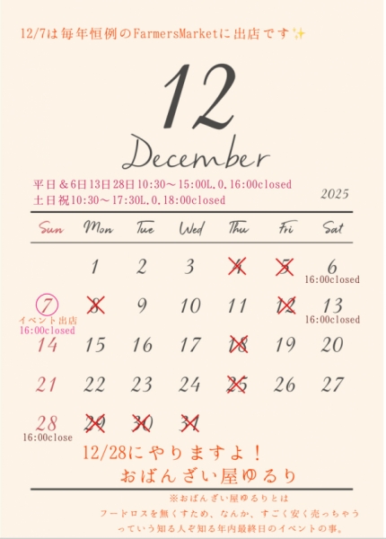 川越のカフェ「きょうのごはん ゆるりCafe」 12月の営業です